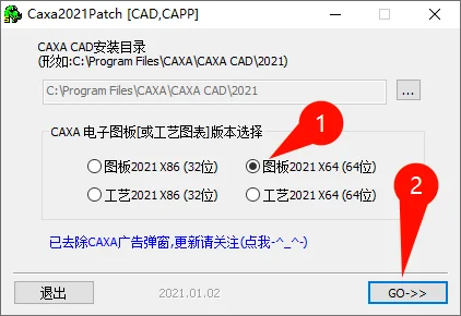 选择【图板2021 X64(64位)】,核对一下上面的安装目录是否一致,如果默认安装就不管。点击【go】