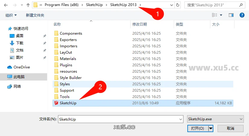 选择安装目录,默认安装目录在C盘:Program Files (x86)/SketchUp/SketchUp 2013,选中Sketchup打开