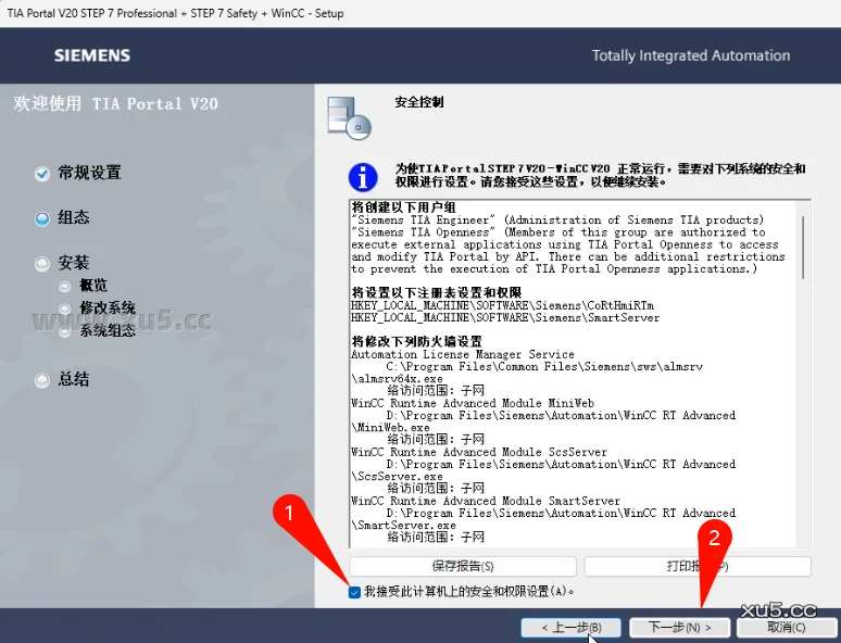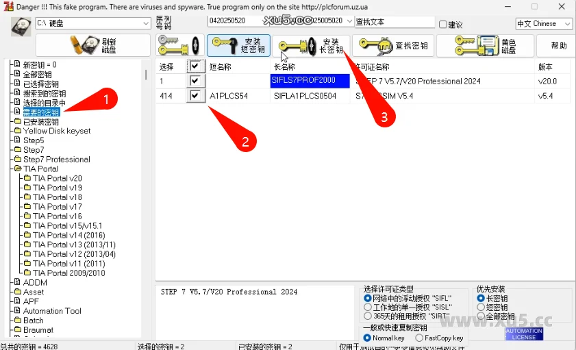 35.双击左侧【TIA portal】,选择【TIA portal v20】,然后把右侧所有产品勾选上,点击【安装长密钥】