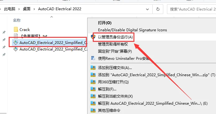 2. 选择 AutoCAD_Electrical_2022_Simplified_Chinese_Win_64bit_dlm_001_002.sfx.exe 鼠标右键以管理员身份运行。