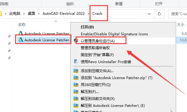 11.打开 Crack补丁 文件夹,选择 Autodesk License Patcher.exe,鼠标右键以管理员身份运行。