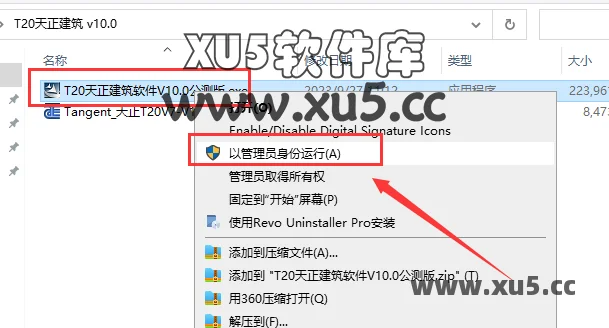 8. 选择Tangent_天正T20V7-V10补丁.exe,鼠标右键以管理员身份运行