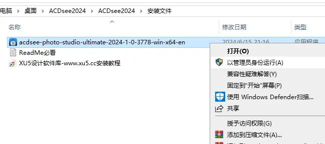 右键管理员运行安装文件夹中ACDSee-photo-studio-ultimate-2024-1-0-3778-win-x64-en,全程默认安装就行