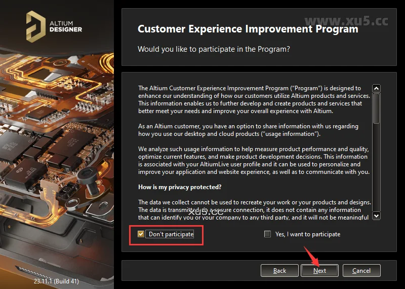 7.点击 Don't participate,然后点击 Next。