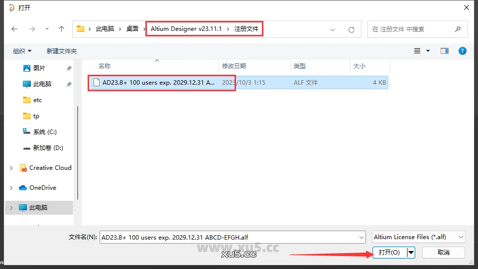 16. 弹出弹窗,找到软件安装包 -【补丁文件】文件夹- 【注册文件】文件夹 - 【AD23.8+ 100 users exp. 2029.12.31 ABCD-EFGH.alf】 打开。