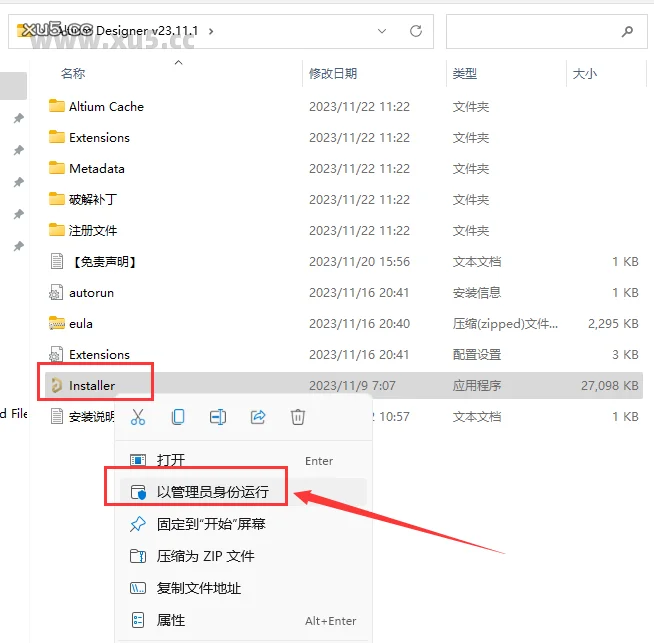 2. 打开【安装包】文件夹,选择【Installer.Exe】,鼠标右键以管理员身份运行。