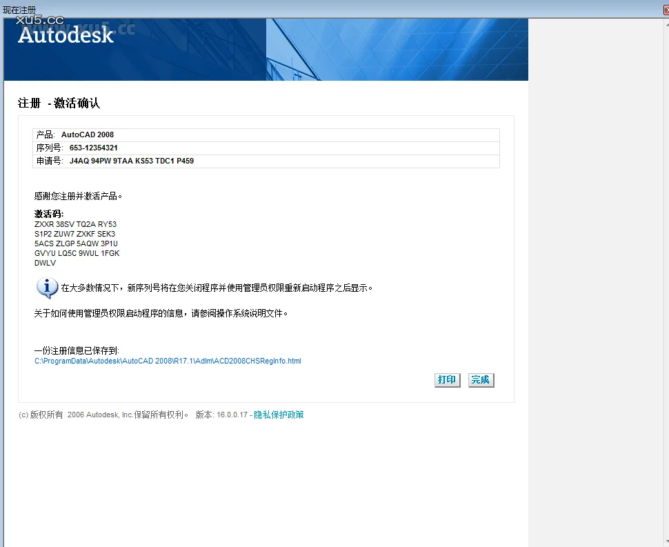 打开【注册机】文件夹中【AutoCAD-2008-keygen】,先再序列号处输入【653-12354321】,再将cad申请号复制到破解补丁中点击【calculate】生成激活码,将激活码粘贴到cad软件处,点击下一步