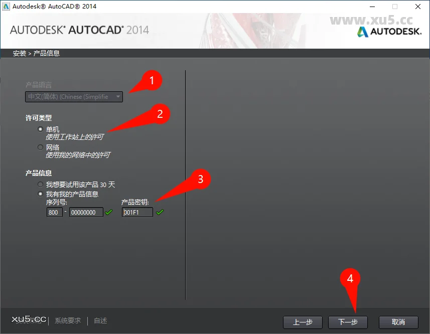 选择许可类型【单机】,输入序列号【800-00000000】,密钥【001F1】,点击下一步