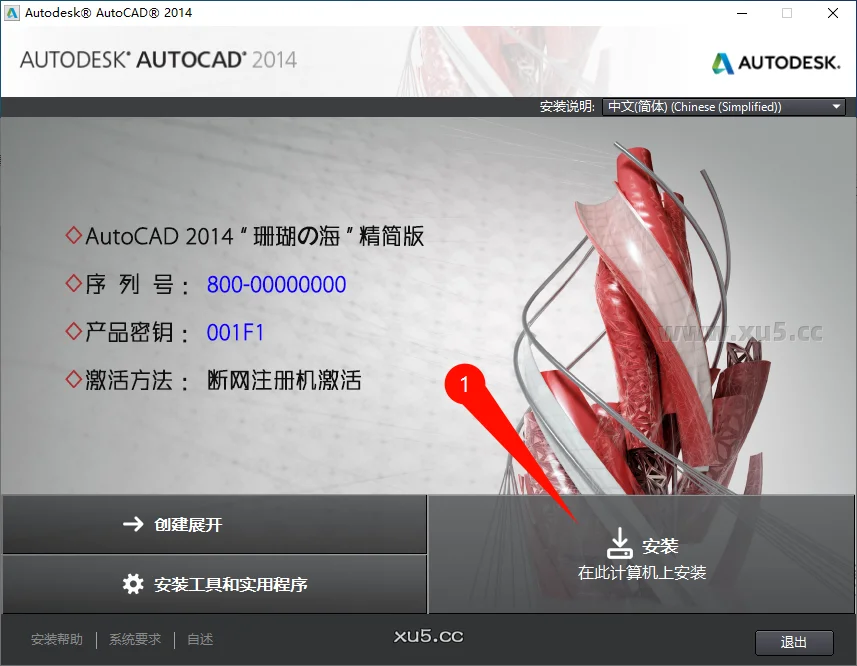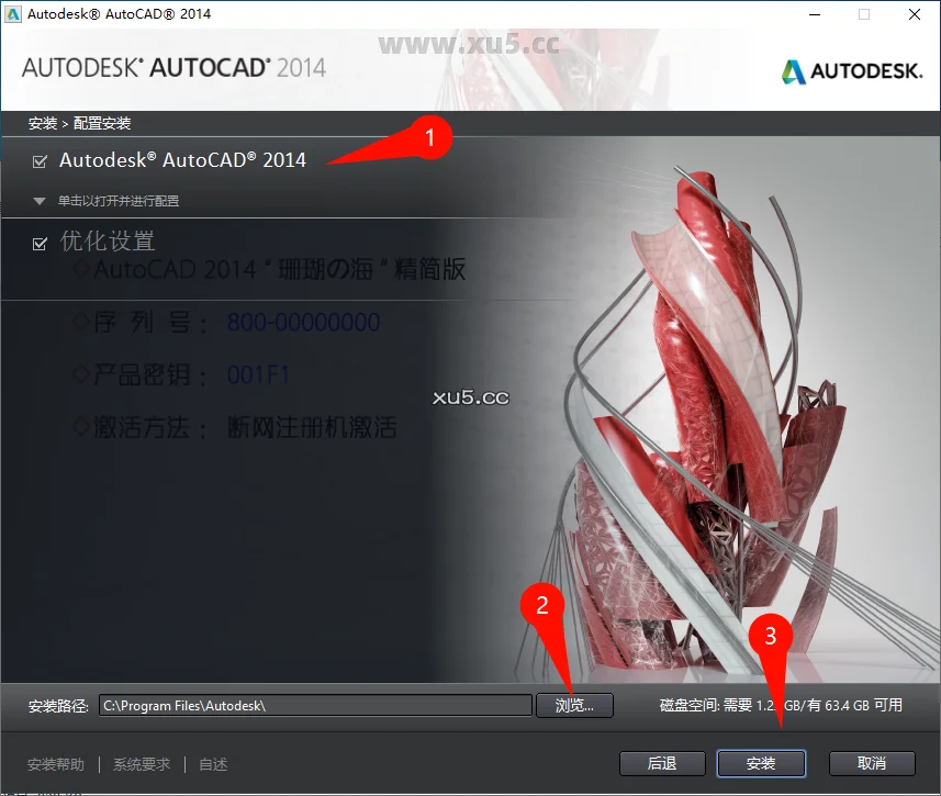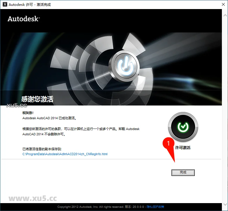 到这里激活页面的时候,打开【注册机】文件夹,右键管理员运行【xf-adsk2014_x64】注册机,将软件的【申请号】复制到注册机,点击【patch】,再点击【generate】,将生成的激活码粘贴到软件中,点击下一步。激活成功就可以使用了