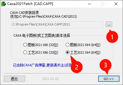 选择【工艺2021】对应系统位数,上面确保安装目录正确,点击go,提示成功后就可以使用了