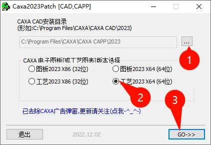 选择【工艺2023】对应系统位数,上面确保安装目录正确,点击go,提示成功后就可以使用了