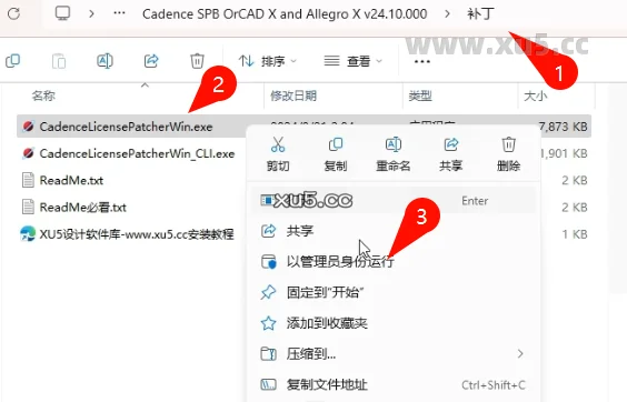 打开【补丁】文件夹,右键管理员运行【CadenceLicensePatcherWin.exe】