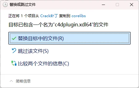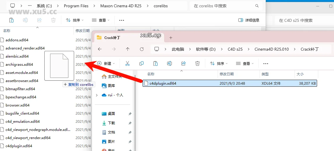 打开安装目录后,继续打开corelibs文件夹,将安装包中的c4dplugin.xdl64复制到corelibs文件夹替换掉