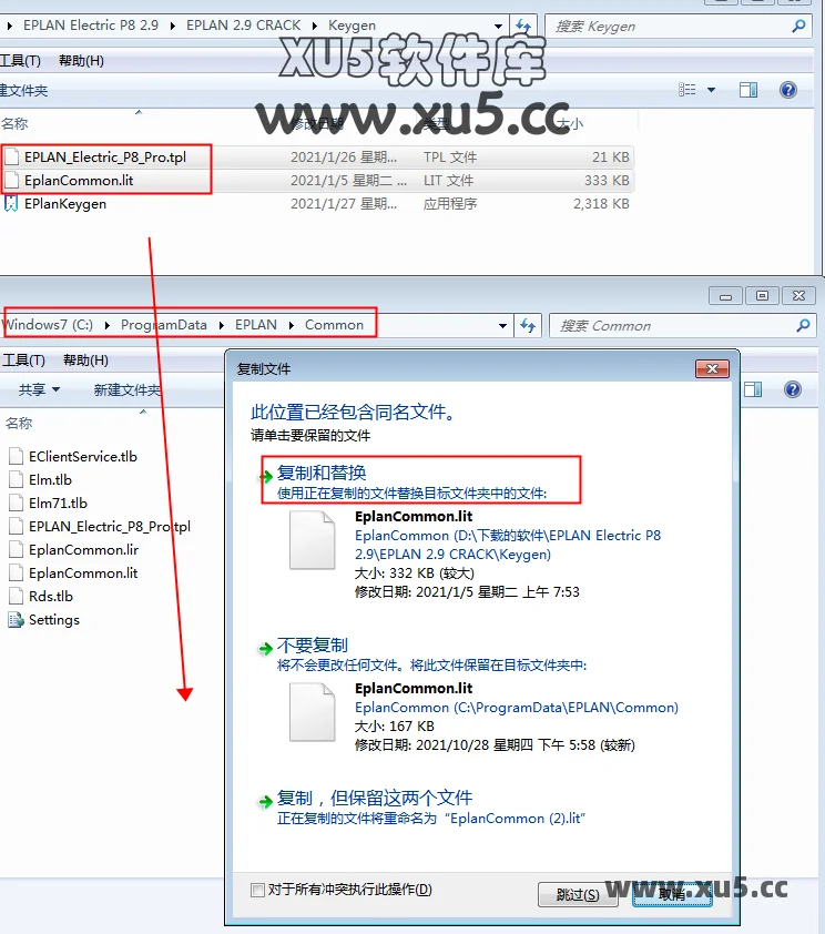 将“Keygen”文件夹里的“EplanCommon.lir”和“EplanCommon.lit”文件复制粘贴到下面的路径中,并替换掉原来的文件: 默认路径【C:ProgramDataEPLANCommon】。