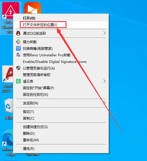 9. 在桌面上找到“EPLAN Electric”软件图标,右键点击“打开文件所在位置”(这里就是安装目录)