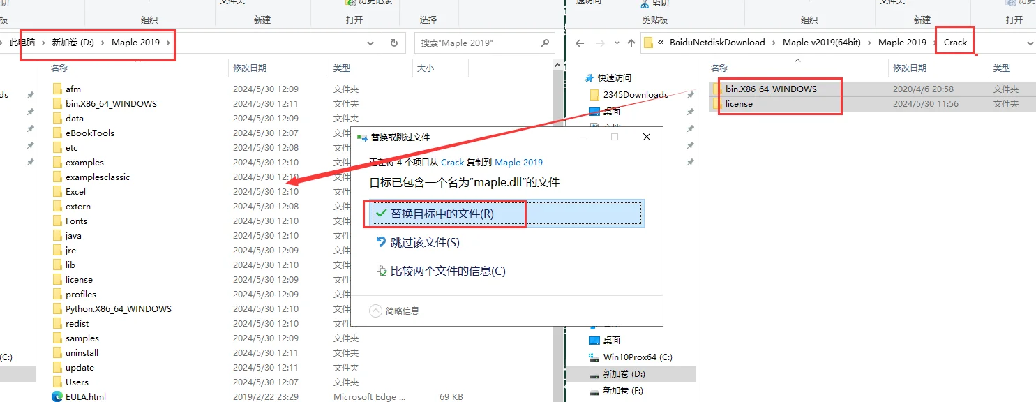 14.将 【Crack 】文件夹中的两个破解文件【bin.X86_64_WINDOWS】和【license】复制到软件安装目录位置下粘贴。弹出替换对话框后,点击替换目标中的文件。