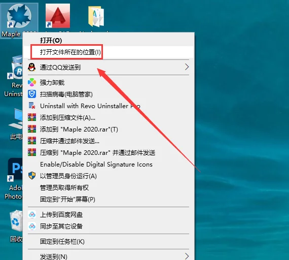 13.在电脑桌面找到软件,鼠标右键【Maple】打开文件所在的位置进入【安装目录】。