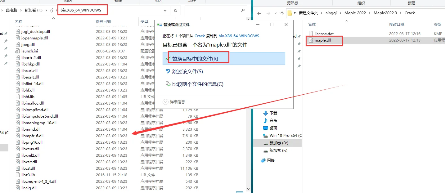 复制【Crack】文件夹的【Maple.dll】到软件安装目录bin.X86_64_WINDOWS文件夹里面去替换