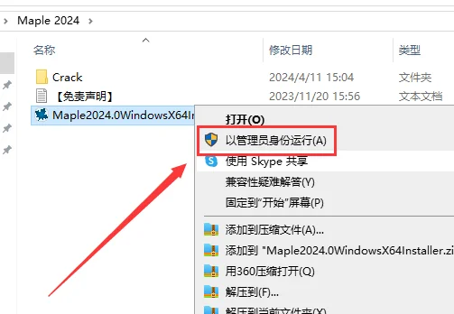 2.选择【Maple2024.0WindowsX64Installer.exe】鼠标右键以管理员身份运行。