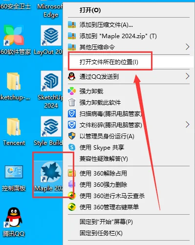13.在电脑桌面找到【Maple 2024】软件,鼠标右键打开文件所在的位置进去【安装目录】位置。
