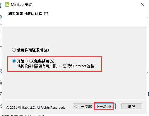 8.勾选选择开始免费试用,然后下一步