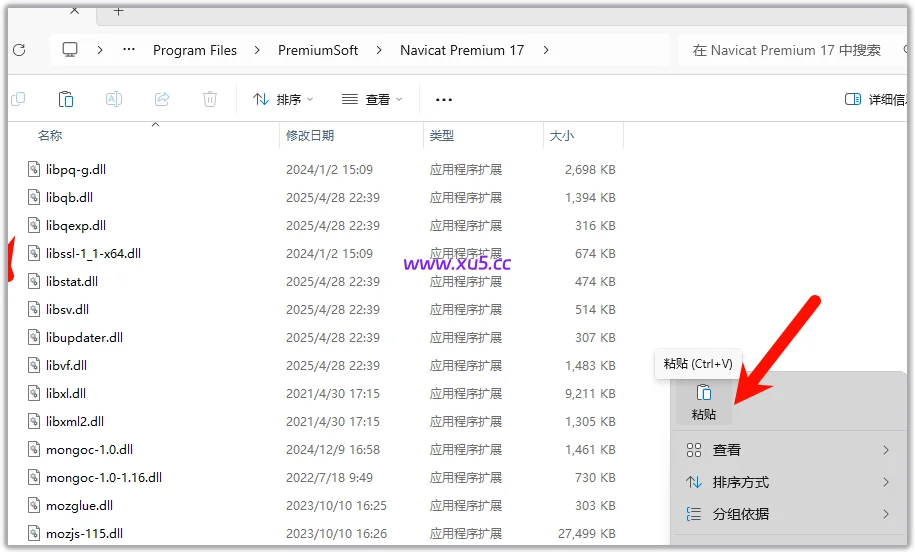 4.将安装包中补丁文件夹里面的【winmm】【无限试用Navicat】两个粘贴到安装目录。