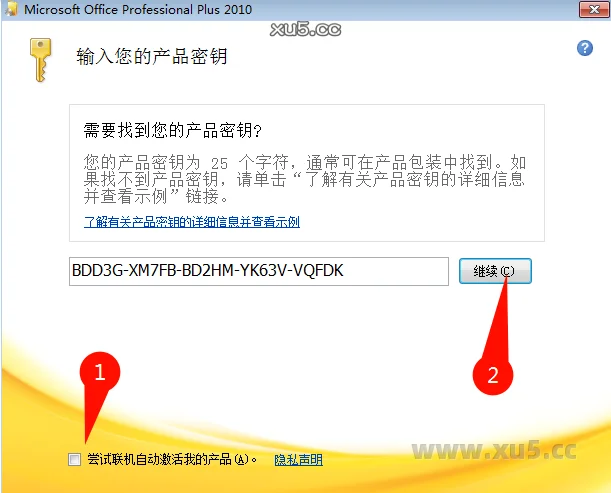输入激活码【6QFDX-PYH2G-PPYFD-C7RJM-BBKQ8】或者【BDD3G-XM7FB-BD2HM-YK63V-VQFDK】,取消勾选,点击继续
