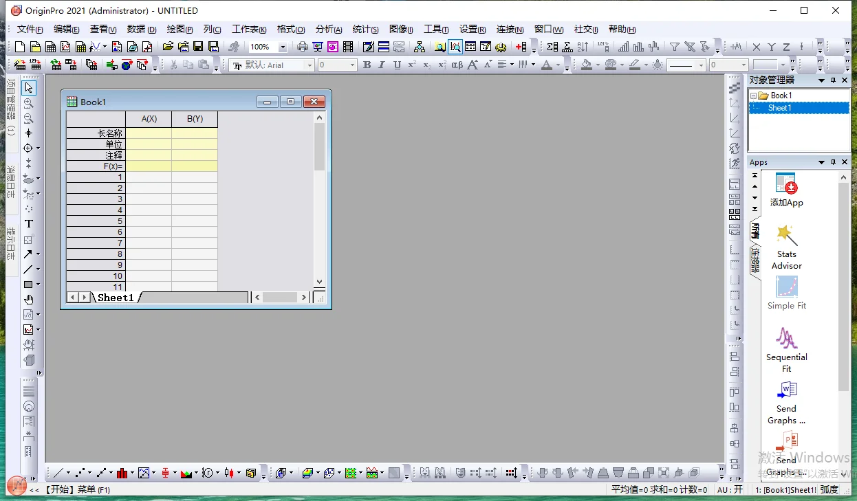 此时 Origin 界面已经更改为中文,可以正常使用。