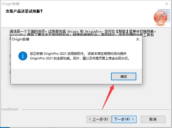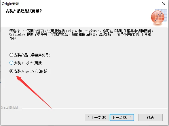 勾选安装 OriginPro 试用版并点击“下一步”。