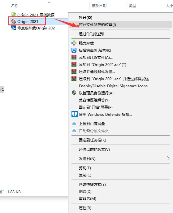 右键点击 【Origin 2021】 快捷方式并选择“打开文件位置”,也就是安装目录