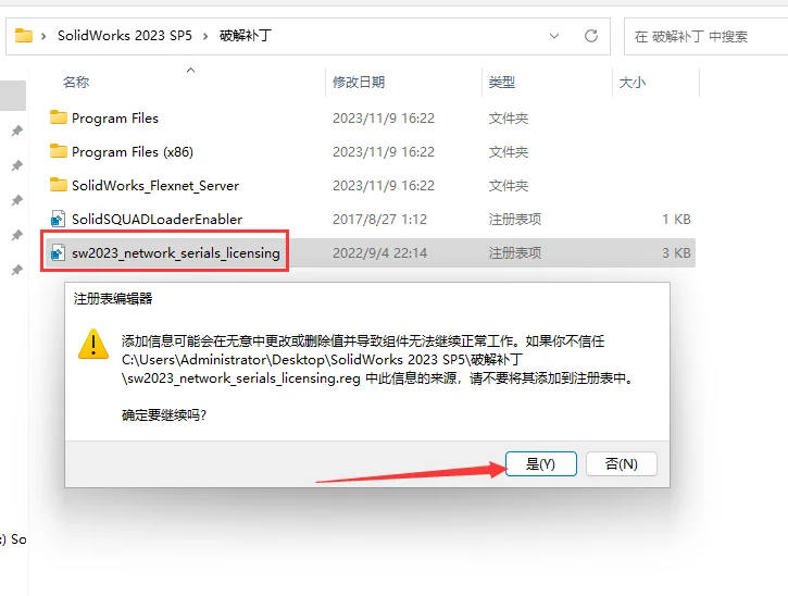 打开【_SolidSQUAD_】文件夹,找到 sw2023_network_serials_licensing.reg 双击运行,点击是。