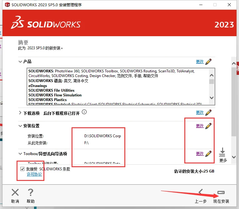 选择产品,不用的不用勾选,点击更改可以进入将路径进行更改(注意更改路径不能带有中文或者特殊符号),勾选软件许可协议接受,然后点击现在安装。