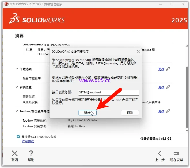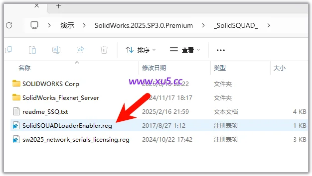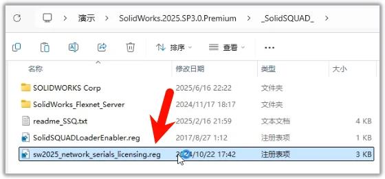 5然后返回安装包中【_SolidSQUAD_】,运行【sw2025_network_serials_licensing】注册表。
