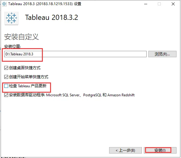 4.软件安装位置可直接在路径上更改或点击浏览更改(注意路径不能带有中文或特殊符号)。取消勾选【检查 Tableau 产品更新】,然后点击【安装】。