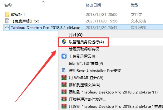 2. 安装程序运行,选择 【Tableau Desktop Pro 2018.3.2 x64.exe】,鼠标右键以管理员身份运行。
