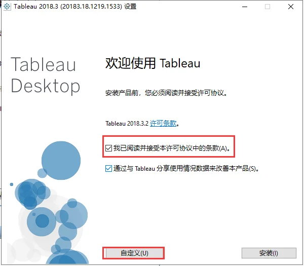 3. 勾选【我已阅读并接受本许可协议中的条款(A)】,点击【自定义】。