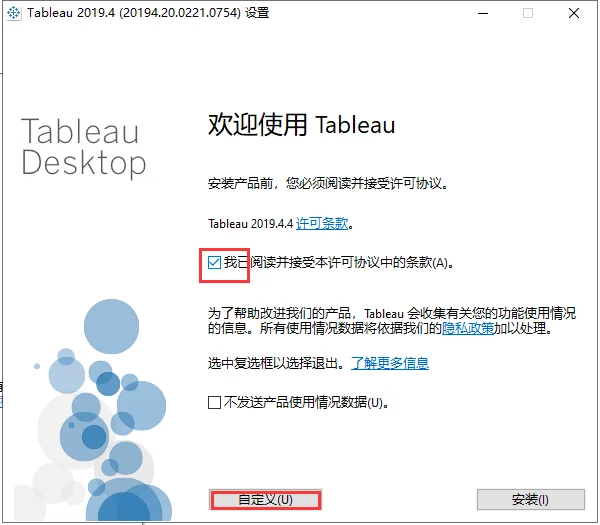 3.勾选“我已阅读并接受”,然后点击“自定义”。