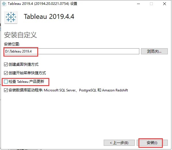 4.更改安装路径(注意:路径不能带有中文或特殊符号)。取消勾选检查更新选项,最后点击“安装”。