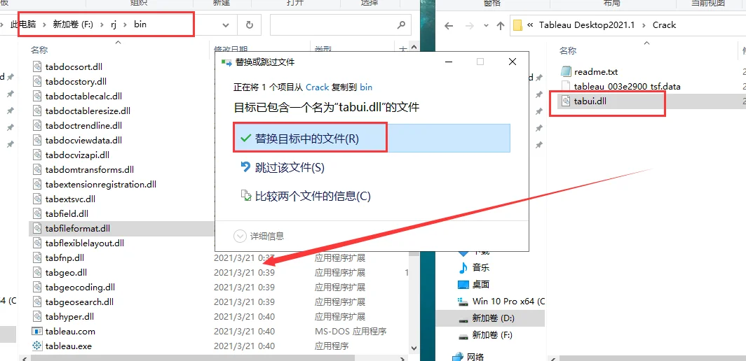8. 打开【Crack补丁】文件夹复制破解补丁【tabui.dll】,打开软件安装目录(鼠标右键打开Tableau:文件所在的位置即可打开安装目录)。然后将【Crack补丁】文件夹的【tabui.dll】复制到安装目录下替换。